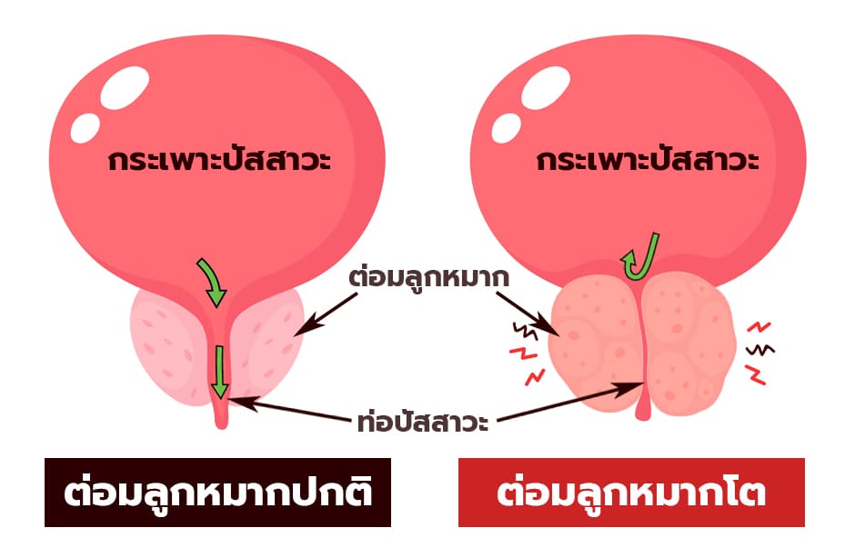 ลองนึกภาพท่อที่น้ำไหลผ่านนะครับ ต่อมลูกหมากก็เหมือนวงแหวนที่ล้อมรอบท่อนี้ไว้ เมื่อต่อมลูกหมากโตขึ้น มันก็จะบีบท่อให้แคบลง ทำให้ปัสสาวะไหลได้ไม่สะดวก หรือไหลได้ช้าลง